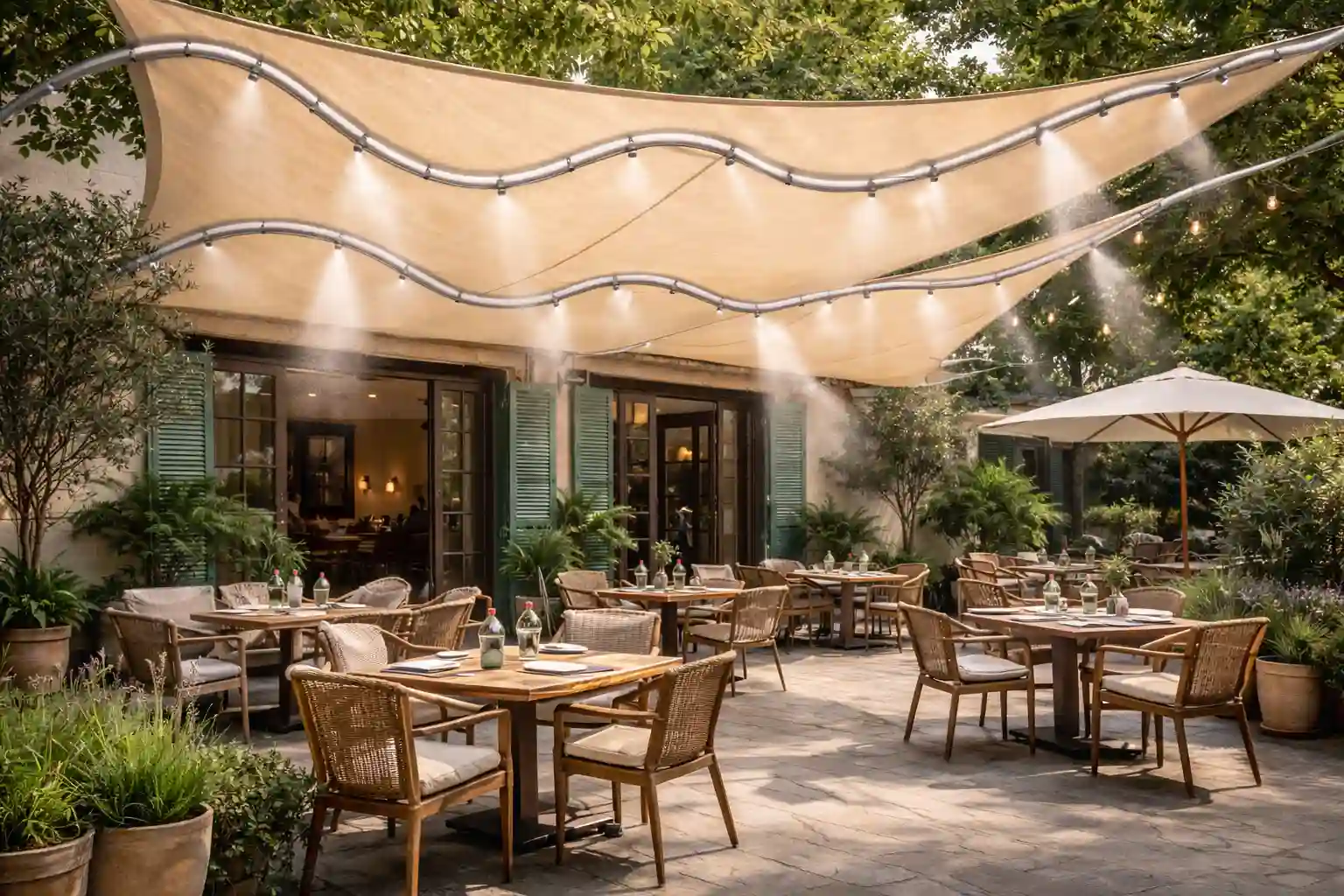 Sonnensegel mit Sprühnebelfunktion eignen sich besonders für Bereiche mit hoher Nutzung und langen Aufenthaltszeiten: